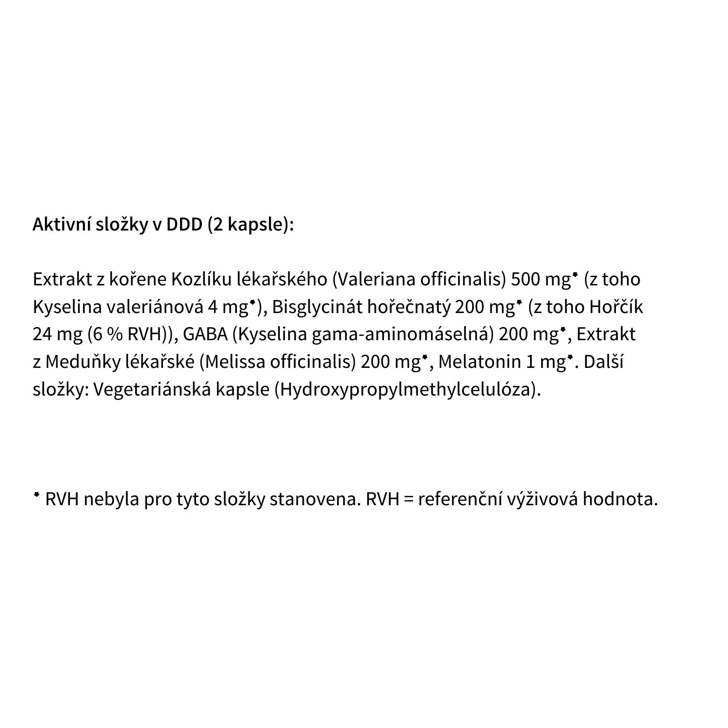 Aktivní látky: Extrakt z kořene Valeriány, Magnesium, GABA, Extrakt z Meduňky lékařské, Melatonin.