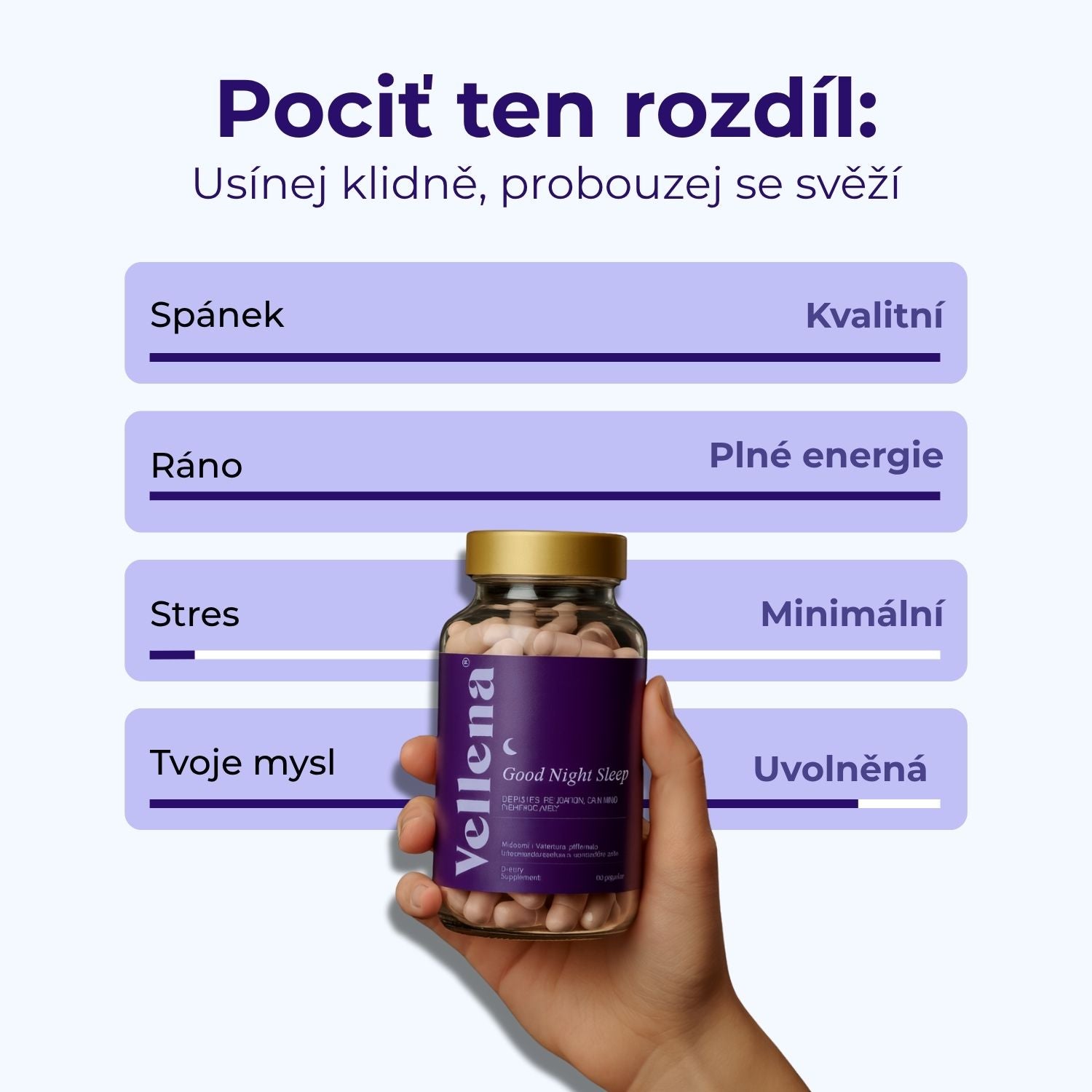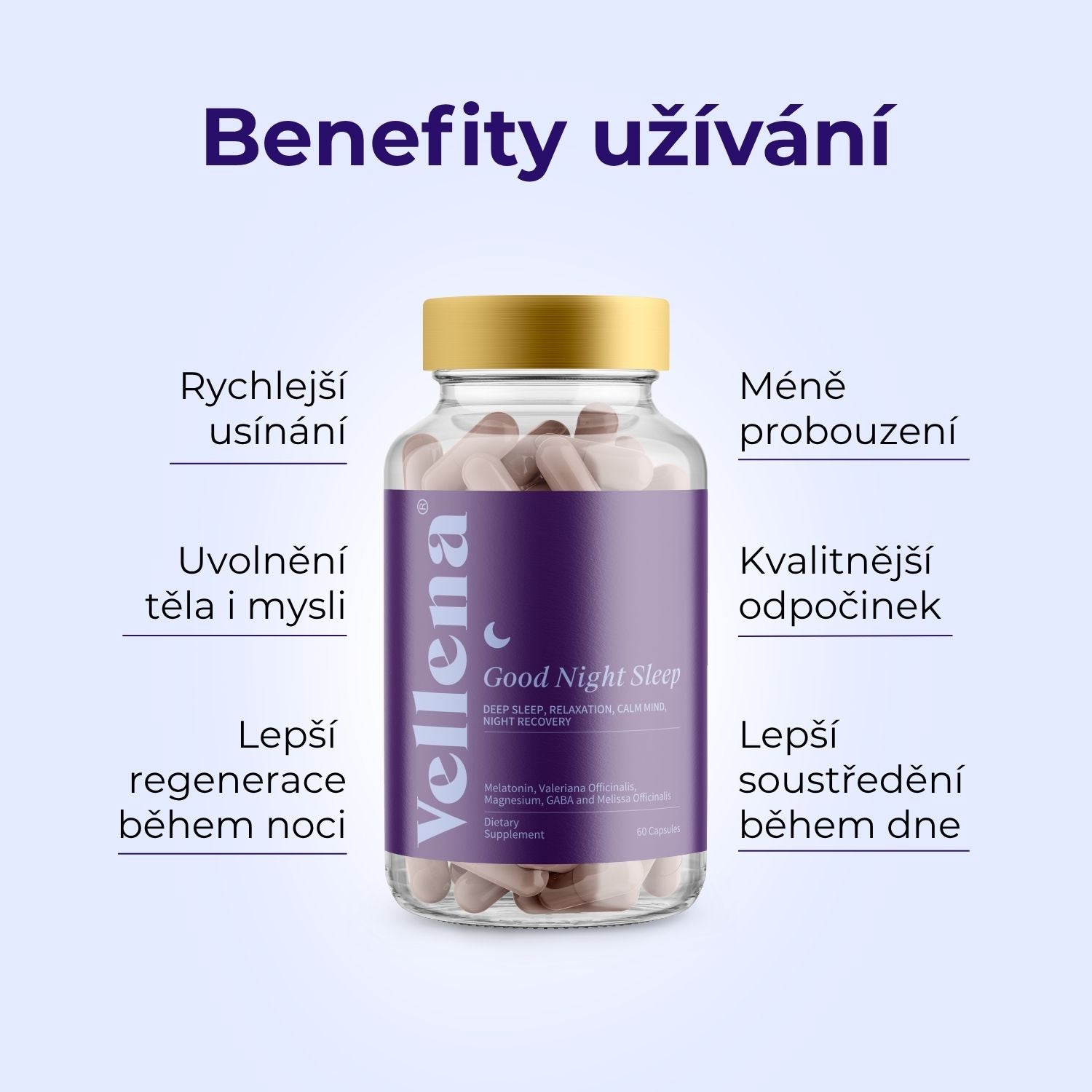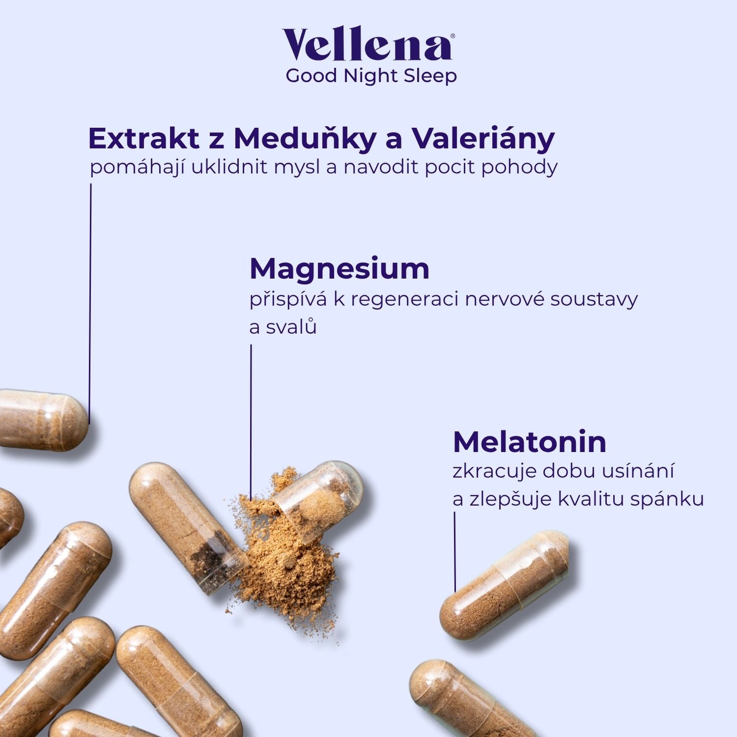 Vellena kapsle Good Night Sleep pomáhají tělu i mysli zpomalit, uklidnit a připravit se na regeneraci a odpočinek. Melatonin a bylinné extrakty napomáhají klidnému usínání a podpoří kvalitní, nepřerušovaný spánek.