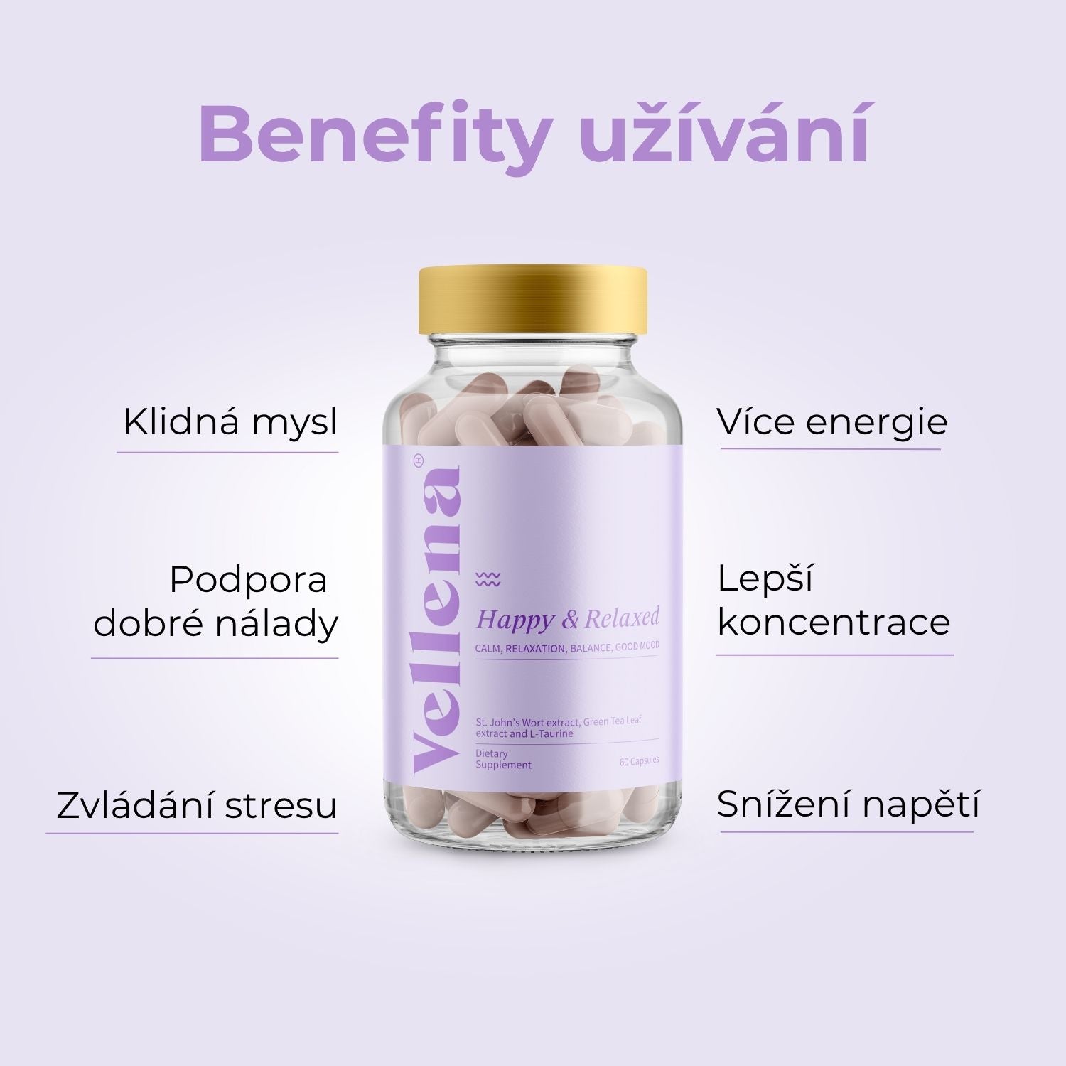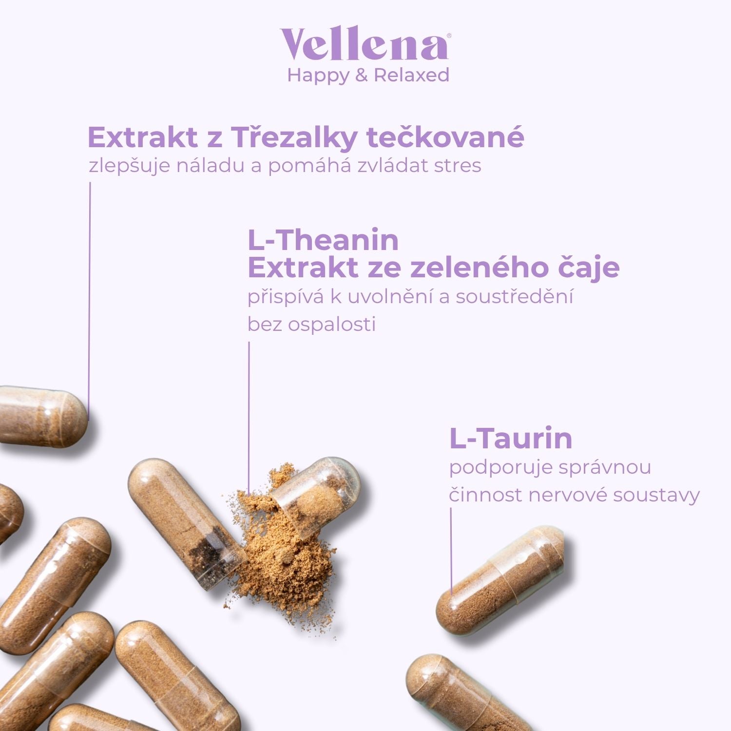 Vellena kapsle Happy & Relaxed ti pomohou zvládat stresové situace, napětí i únavu. Přírodní složení Happy & Relaxed přispívá k psychické pohodě, dobré náladě a podporuje tvorbu serotoninu – hormonu štěstí.