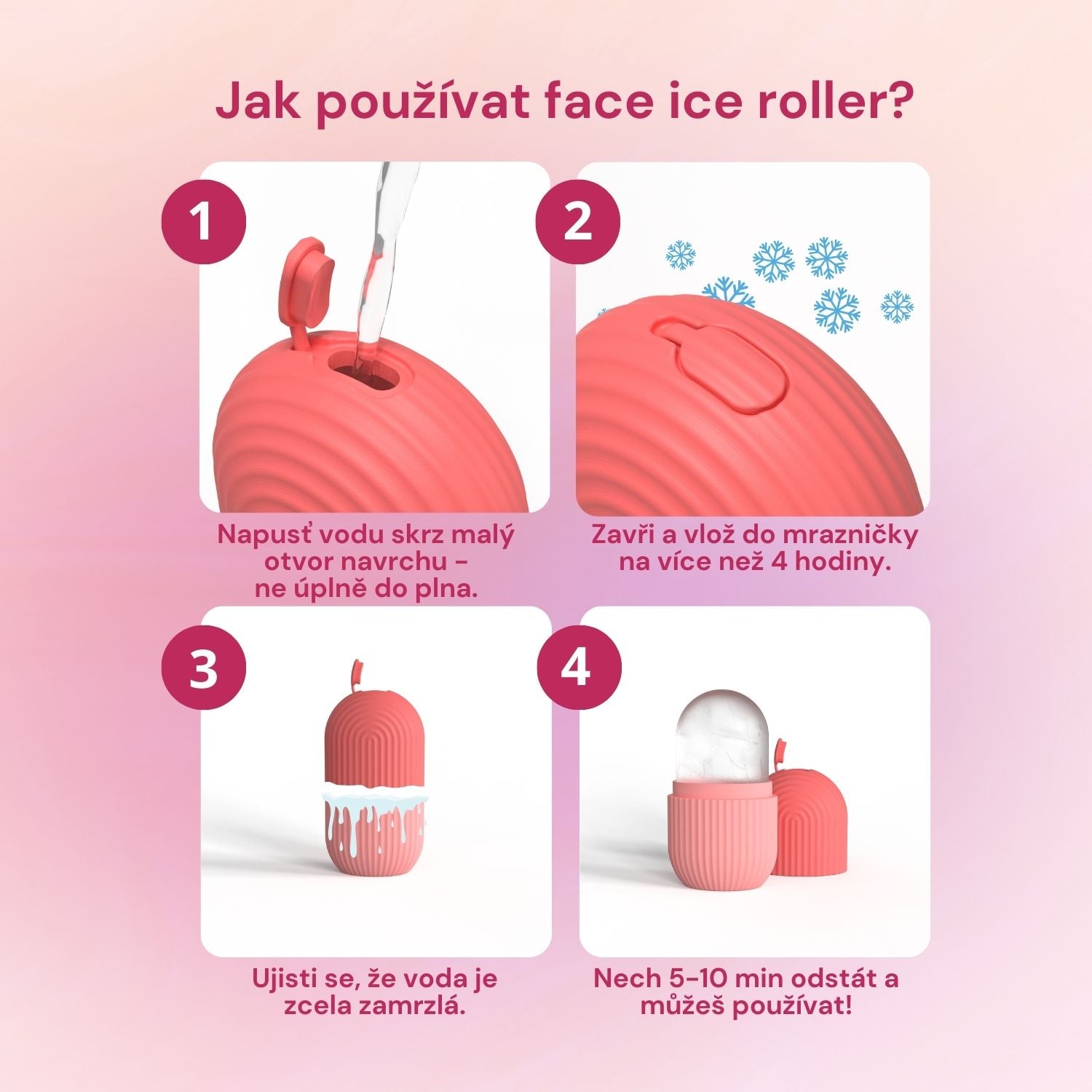 V horní části otevřeš uzávěr a naliješ vodu. Následně ho zavřeš a necháš v mrazničce alespoň 3 hodiny nebo do momentu, dokud voda úplně nezamrzne. Před použitím rolleru ho vyndej z mrazničky a nech při pokojové teplotě stát 5-10min. Jemným pohybem odděl horní část od spodní (pokud se ti zdá, že to jde těžko, potřebuje roller ještě pár minut k rozmrznutí). Následně aplikuj krouživými pohyby na pleť/pokožku pro dosažení dokonalého chladivého efektu.
